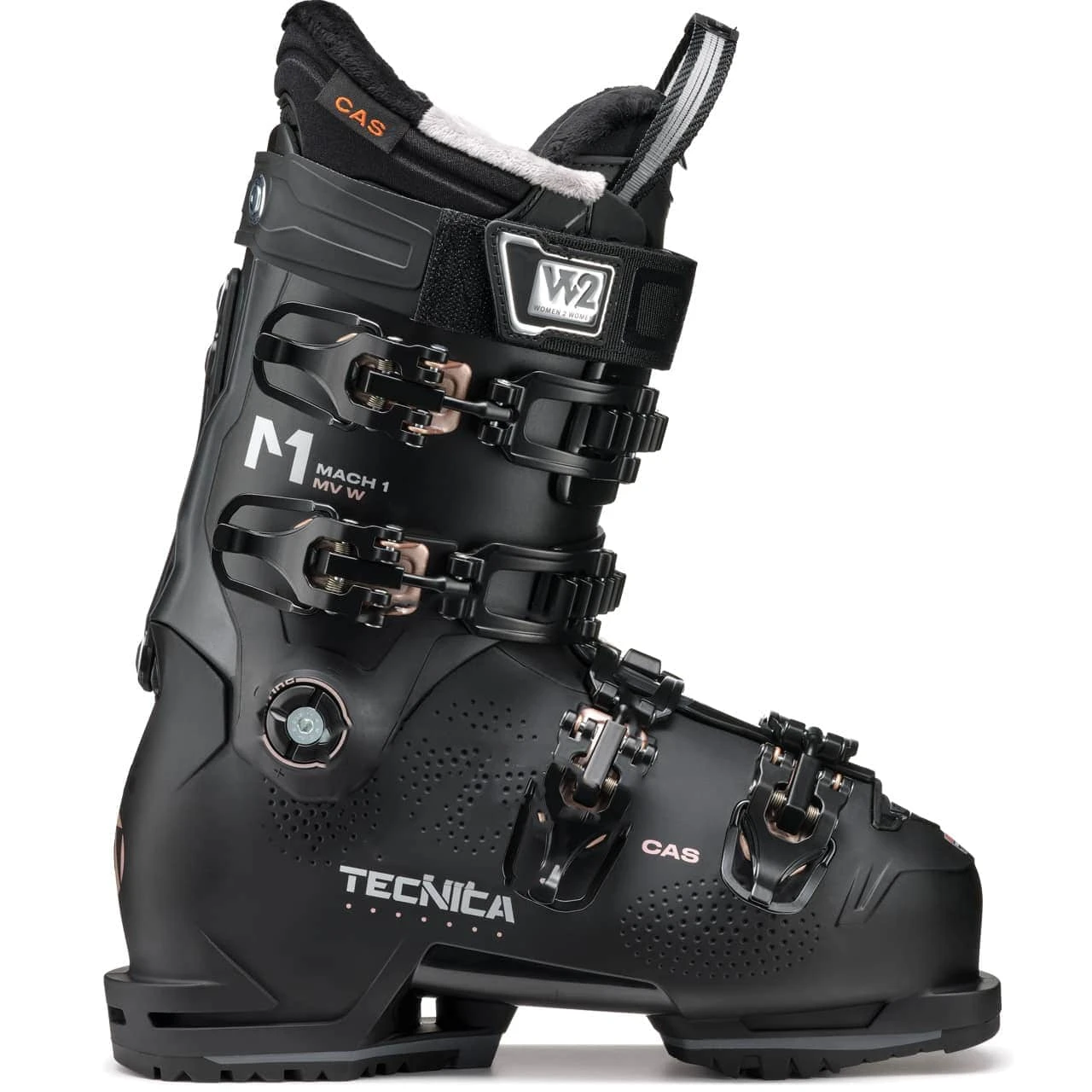 Tecnica presents the Mach1 MV 105 W, a sporty ski boot with 105 flex and medium last, specially developed for women. If the boot does not fit on the first fitting, it can be individually adjusted thanks to the C.A.S. (Custom Adaptive Shape) system with numerous fitting options for the shell and inner boot. The merino wool liner with Celliant microcrystals keeps feet pleasantly warm by stimulating blood circulation, even in icy mountain temperatures. To make putting on and taking off the boots easier, Tecnica integrates the Lift-Lock system, where the buckles remain at a 45° angle after opening.